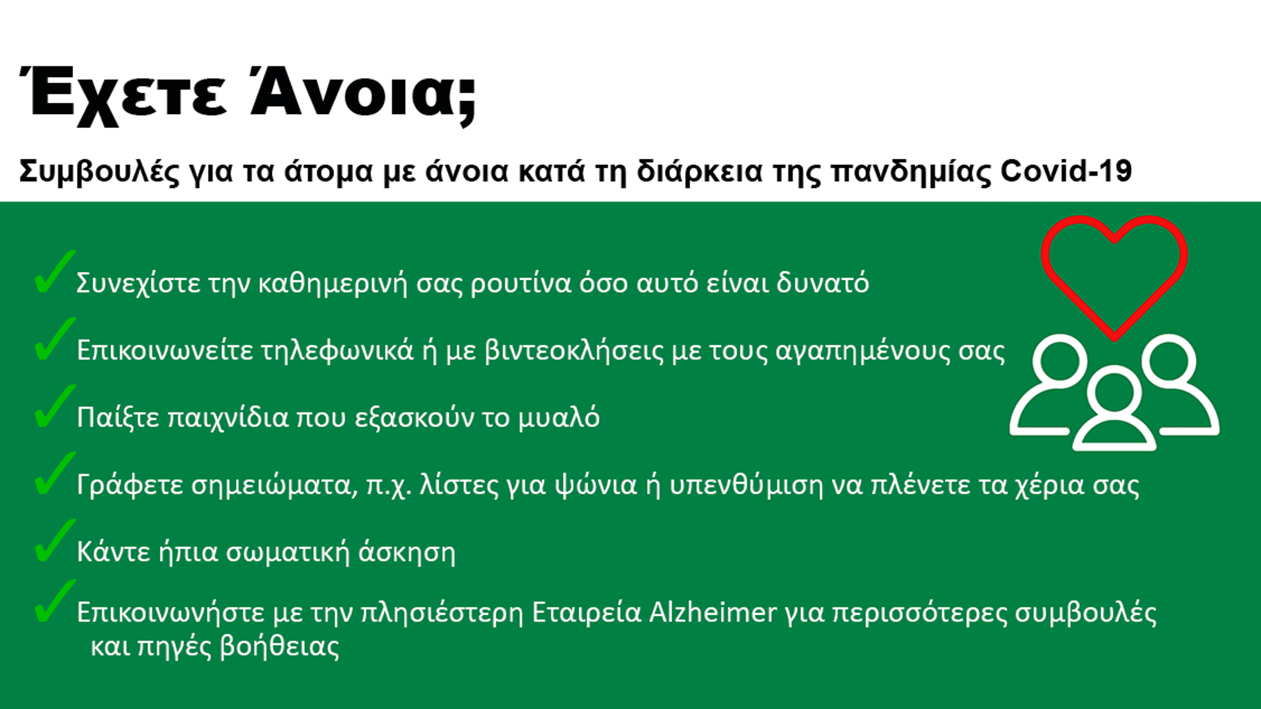 - Στο βαθμό που είναι σε θέση να το κατανοήσει, ενημερώστε το άτομο με άνοια που φροντίζετε με απλά λόγια για τη σοβαρότητα της κατάστασης. Αποφύγετε την έκθεση του σε πολλά ενημερωτικά ερεθίσματα από τα ΜΜΕ.