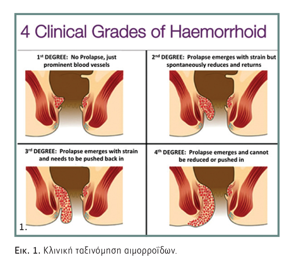 Οι εσωτερικές αιμορροΐδες είναι δυνατόν να διακριθούν σε τέσσερις κατηγορίες (Εικόνα 1):