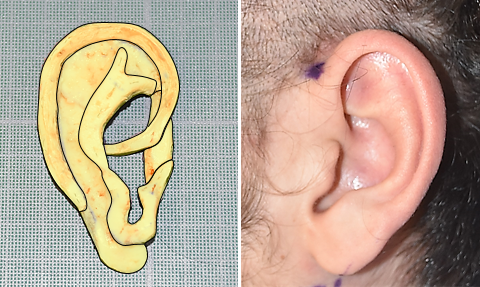 Εικ. 3, 4. Δεξιά μικρωτία και αποτέλεσμα αμέσως μετά την τοποθέτηση του χόνδρινου σκελετού κάτω από το δέρμα και την εφαρμογή αρνητικής πίεσης.