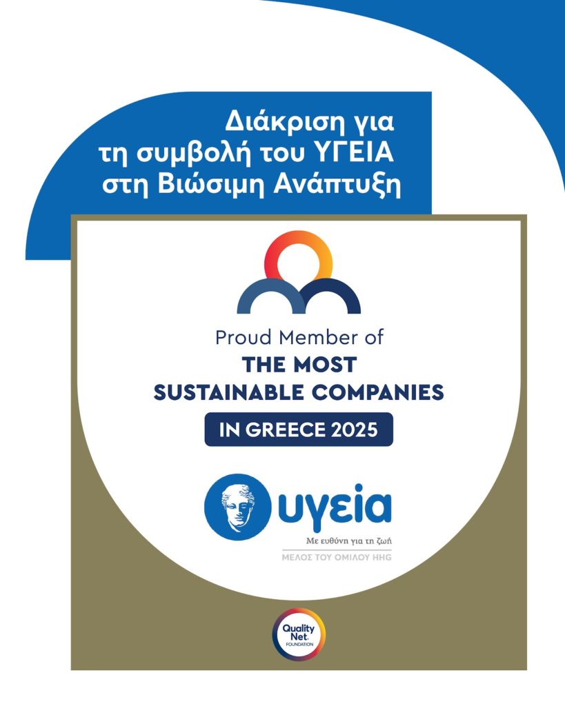 Για έβδομη συνεχή χρονιά, το ΥΓΕΙΑ συγκαταλέγεται στις “The Most Sustainable Companies in Greece 2025”, όπως ανακοινώθηκε από τον Οργανισμό QualityNet Foundation, αποδεικνύοντας τη σταθερή του δέσμευση στα θέματα Βιώσιμης Ανάπτυξης.