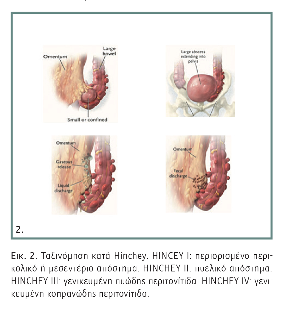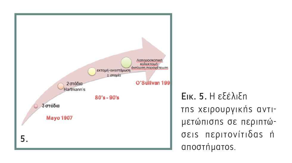 Παλαιότερα (Εικόνα 5), οι επεμβάσεις τριών σταδίων ήταν ο κανόνας, δηλαδή προσωρινή κολοστομία και πιθανώς μία ή δύο επεμβάσεις μετά για την αποκατάσταση της στομίας, με μεγάλο μειονέκτημα την παραμονή της σηπτικής εστίας.