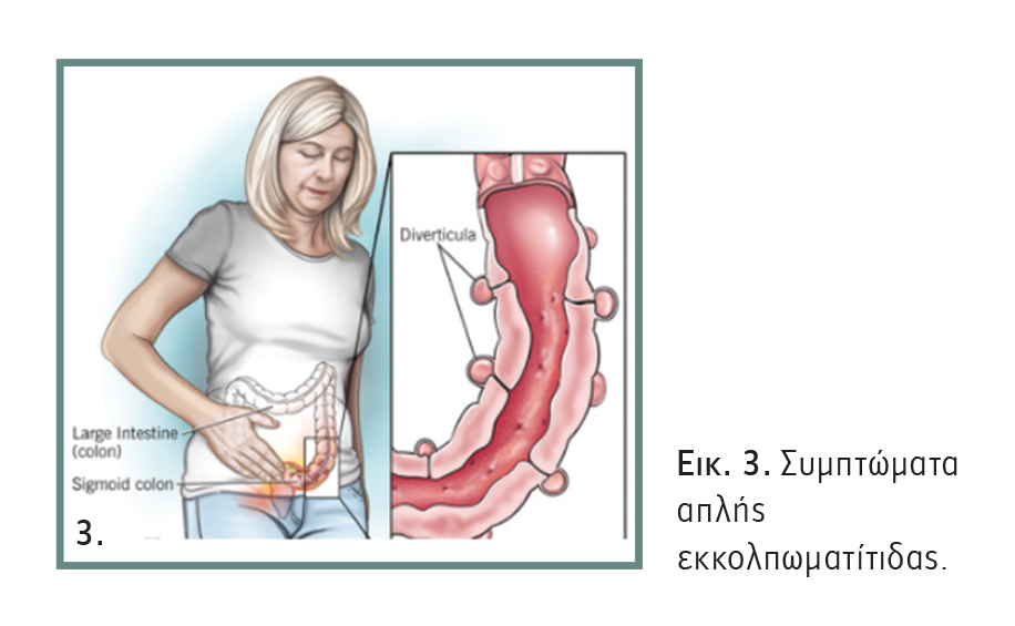 Η απλή εκκολπωματίτιδα προκαλεί πόνο, ιδίως στην αριστερή πλευρά της κοιλιάς, συνοδευόμενο με διαταραχές των κενώσεων, πυρετό και αδυναμία λήψης τροφής, ναυτία και πιθανώς εμέτους. Επίσης, μπορεί να εμφανιστούν συμπτώματα από το ουροποιητικό (συχνουρία, πόνος κατά την ούρηση) (Εικόνα 3).