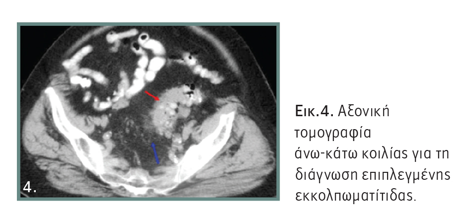 Κλινικά ο ασθενής εμφανίζει σύσπαση στο σημείο της φλεγμονής. Η πρώτη εξέταση που πρέπει να γίνει, είναι ο αιματολογικός έλεγχος, με τον οποίο συνήθως διαπιστώνεται αύξηση των λευκών αιμοσφαιρίων, αλλά και των δεικτών φλεγμονής. Στη συνέχεια, μια καλή υπερηχοτομογραφική μελέτη θα θέσει τη διάγνωση και είναι αρκετή σε απλές περιπτώσεις. Όμως, σε επιπλεγμένη εκκολπωματίτιδα, όπου χρειάζεται νοσηλεία, είναι απαραίτητη η αξονική τομογραφία άνω-κάτω κοιλίας (Εικόνα 4), για να διαπιστωθεί η έκταση της φλεγμονής και ανάλογα να ληφθούν αποφάσεις για την αντιμετώπισή της.