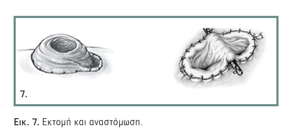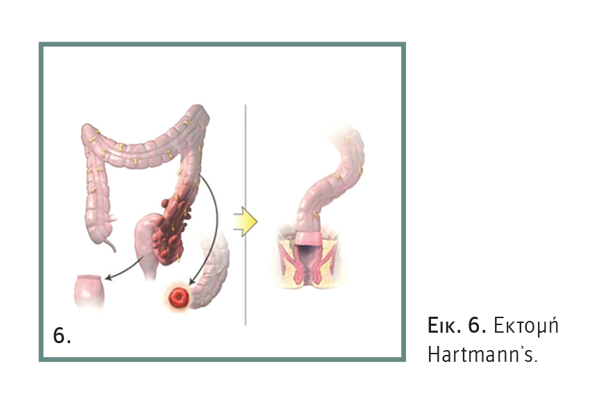 Για τον λόγο αυτό, έγινε στροφή προς εκτομή Hartmann᾽s (Εικόνα 6), που ήταν ο χρυσός κανόνας τη δεκαετία 1980-90, δηλαδή επέμβαση δύο σταδίων: εκτομή του πάσχοντος τμήματος και κολοστομία και σε δεύτερο χρόνο σύγκλειση της στομίας. Όμως, και εδώ η νοσηρότητα και η θνησιμότητα ήταν υψηλές, ενώ και λόγω του κακού status πολλών ασθενών, περίπου το 1/3 δεν έφθανε ποτέ σε σύγκλειση της στομίας.