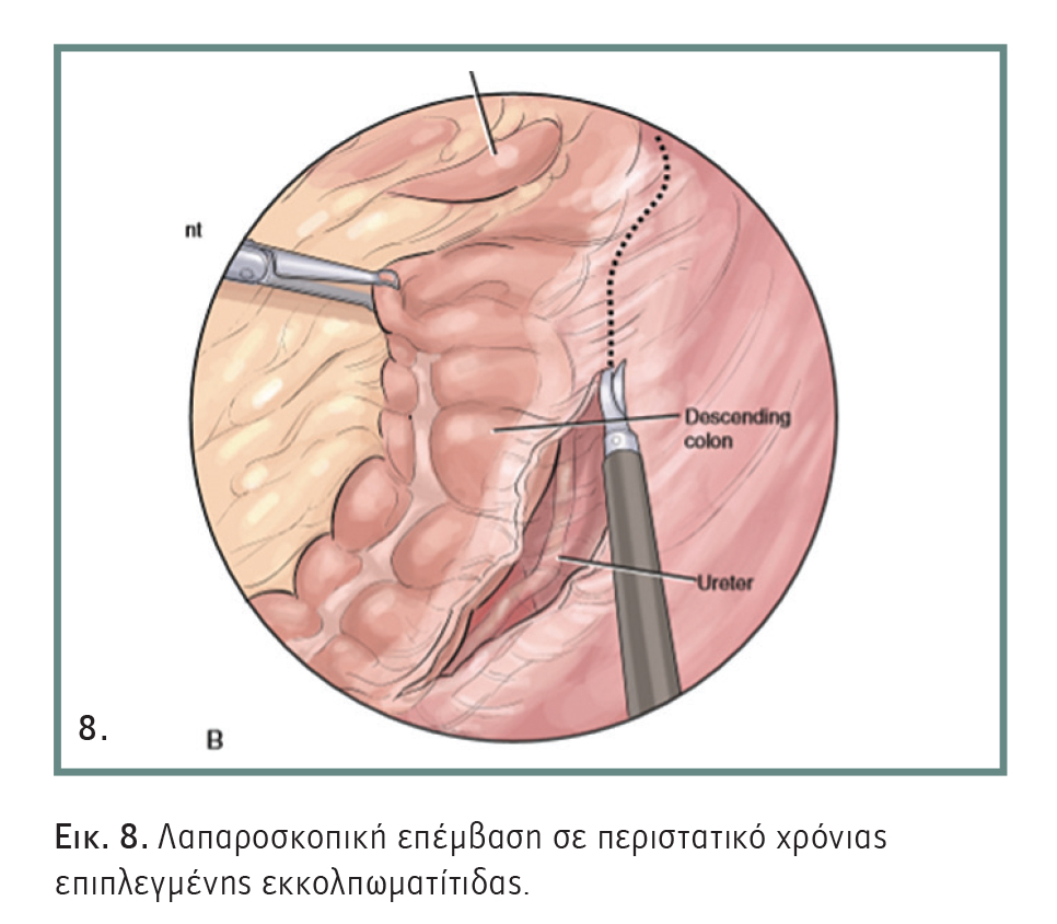 Αναφερόμαστε σε περιπτώσεις πολλαπλών επεισοδίων ή μετά από εμφάνιση σοβαρής επιπλοκής, όπως στένωση ή απόφραξη του εντέρου, καθώς και συριγγίου (συνήθως με την ουροδόχο κύστη ή τον κόλπο). Σε αυτές τις προγραμματισμένες επεμβάσεις χρονίας εκκολπωματίτιδας, η εκτομή του πάσχοντος τμήματος του παχέος εντέρου θα πρέπει να γίνεται λαπαροσκοπικά (Εικόνα 8).