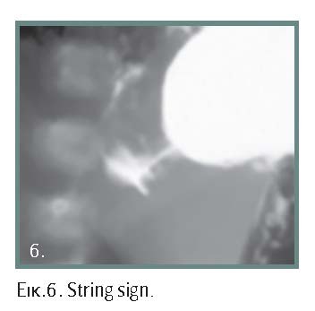 Η διάγνωση τις περισσότερες φορές είναι προφανής, όμως υπάρχουν άτυπες μορφές που μπορεί να προβληματίσουν τον κλινικό ιατρό (εικόνες 1, 2, 3, 4). Αλυσιδωτές επιπτώσεις στον οργανισμό συνθέτουν την κλινική εικόνα και τις επιπλοκές της νόσου. Με την εξέλιξη της κλινικής εικόνας και όσο δεν αντιμετωπίζεται η απόφραξη, μπορεί να εμφανιστούν βαρύτατες οξεοβασικές και ηλεκτρολυτικές διαταραχές. Οι διεγχειρητικές επιπλοκές πρέπει να αναγνωρίζονται και να αντιμετωπίζονται αμέσως γιατί οι επιπτώσεις είναι μοιραίες.