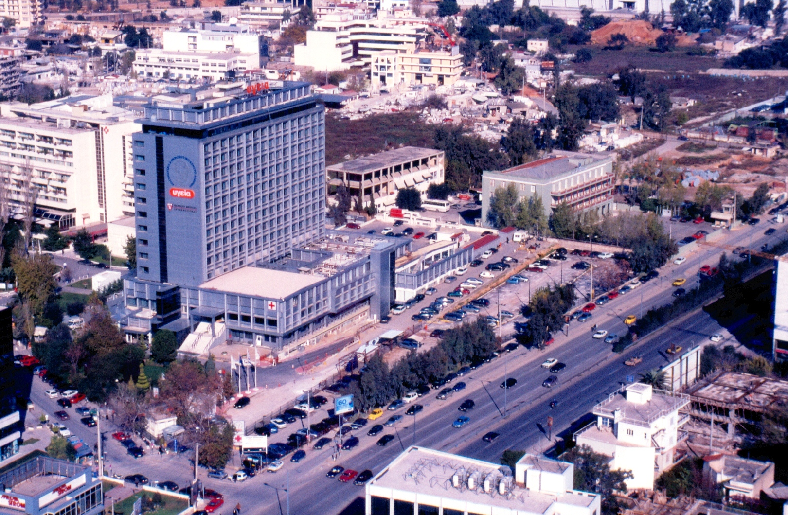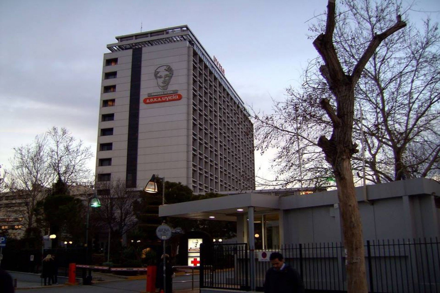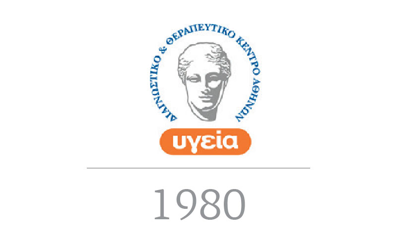 Το πρώτο λογότυπο που σχεδιάστηκε ήταν γραμμικό και τόνιζε το όνομα ΥΓΕΙΑ. Χρησιμοποιήθηκαν στοιχεία αισθητικά, όπως η κυματοειδής απεικόνιση (που τη χρησιμοποιούσαν, κυρίως, στη ζωγραφική αρχαίων αγγείων) και δύο κύπελλα, που είναι έμμεση αναφορά στο σύμβολο-κύπελλο που κρατούσε στο αριστερό της χέρι η θεά Υγεία, απ’ όπου έπινε ο όφις, το σύμβολο της ιατρικής.