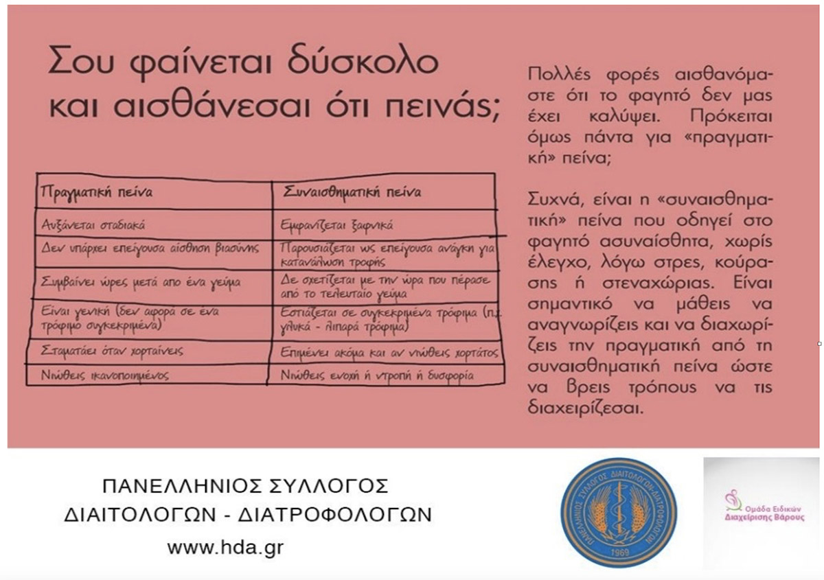 Ένας πολύ καλός τρόπος να διαχωρίσετε την πραγματική πείνα από την συναισθηματική προτείνεται από τον Πανελλήνιο Σύλλογο Διαιτολόγων – Διατροφολόγων στην παρακάτω εικόνα