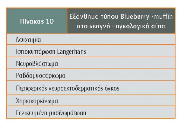 To δέρμα του νεογνού και του βρέφους είναι δυνατόν να οδηγήσει στη διάγνωση συστηματικών νοσημάτων. Στα νεογνά, επί παρουσίας δερματικών βλαβών του τύπου blueberry muffin η διαφορική διάγνωση πρέπει να περιλαμβάνει συγγενείς λοιμώξεις (ΤΟRCH), αιμόλυση, αγγειακές βλάβες και διάφορα ογκολογικά νοσήματα όπως φαίνεται στον πίνακα 10 (Mondi).