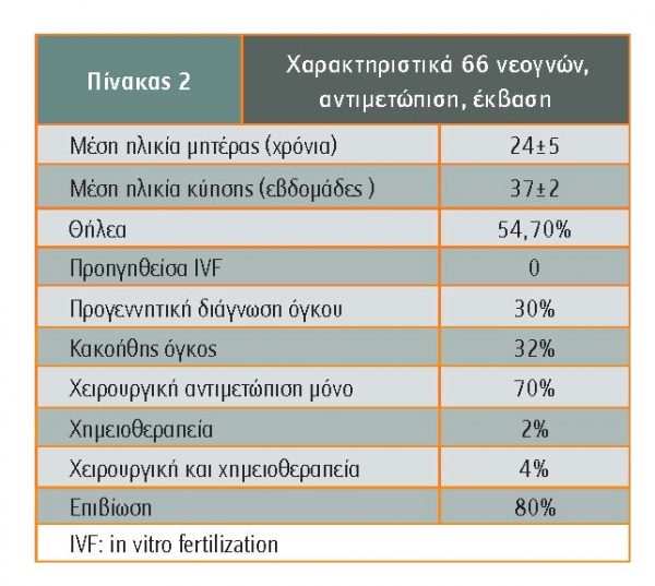 Σε μελέτη 66 νεογνών που εμφάνισαν κάποιο τύπο όγκου καρκίνου, η μητέρα ήταν <30 χρόνων, η ηλικία κύησης >35 εβδομάδες και ο όγκος στο 1/3 περίπου είχε διαγνωστεί προγεννητικά, όπως φαίνεται στον πίνακα 2 (Kadivar).