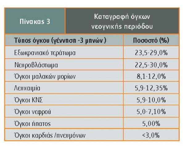 Σε σύστημα καταγραφής όγκων νεογνικής περιόδου (γέννηση μέχρι 3 μηνών) σε περίοδο 30 χρόνων καταγράφηκαν 170 όγκοι, μεταξύ των οποίων 21 λευχαιμίες, 14 όγκοι του ΚΝΣ και 135 διάφοροι συμπαγείς όγκοι. Όπως φαίνεται στον πίνακα 3, από αυτούς 58% καταγράφηκαν τον πρώτο μήνα ζωής και η συχνότερη διάγνωση (29%) ήταν ώριμο τεράτωμα (Parkes).