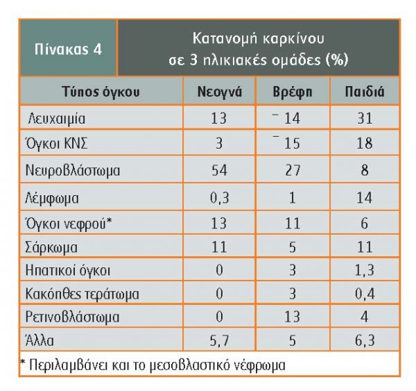 Η συχνότητα ανάπτυξης διάφορων τύπων καρκίνου στις 3 ηλικιακές ομάδες νεογνών, βρεφών και μεγαλύτερων παιδιών, ποικίλλει (Kosmidis). Στον πίνακα 4 εμφανίζεται η αυξημένη συχνότητα νευροβλαστώματος στα νεογνά και βρέφη και λευχαιμίας στα μεγαλύτερα παιδιά, ενώ είναι περίπου ίδια η συχνότητα όγκων του ΚΝΣ σε βρέφη και μεγαλύτερα παιδιά.