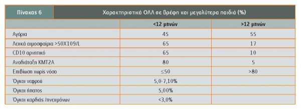 - Βρεφική λευχαιμία: H βρεφική λευχαιμία (διάγνωση μετά τον πρώτο μήνα και έως τον 12ο μήνα της ζωής) είναι επίσης σπάνια, με επίπτωση 41 ανά 1.000.000 βρέφη. Η συχνότητα της οξείας λεμφοβλαστικής λευχαιμίας (ΟΛΛ) στα βρέφη είναι μικρότερη από εκείνη σε παιδιά 1-14 χρόνων και ίση με εκείνη σε εφήβους, η λευχαιμία είναι συχνότερα Β προέλευσης και προσβάλλει περισσότερο κορίτσια, ενώ η συχνότητα της οξείας μυελογενούς λευχαιμίας στα βρέφη είναι διπλάσια από τη συχνότητα σε μεγαλύτερα παιδιά και εφήβους Στα βρέφη με ΟΛΛ η παρουσία χρωμοσωμικών μεταθέσεων μεταξύ του γονιδίου ΚΜΤ2Α στη θέση 11q23 (προηγούμενη ονομασία MLL -mixed lineage leukemia) και άλλων γονιδίων, μεταξύ των οποίων το συχνότερο (περίπου 50%) είναι το ΑFF1 (προηγούμενη ονομασία AF4), είναι συχνή (70%-80%) σε αντίθεση με τα μεγαλύτερα παιδιά, στα οποία η αναδιάταξη του γονιδίου ΚΜΤ2Α είναι μόλις 5%). Ηλικία <6 μηνών (σε αμερικανικά πρωτόκολλα <3 μηνών), αριθμός λευκών αιμοσφαιρίων >300.000 και αναδιάταξη του γονιδίου ΚΜΤ2Α-r έχουν ακόμη χειρότερη πρόγνωση (Brown). Μελέτη των νεογνικών καρτών Guthrie έχει δείξει την παρουσία συγχώνευσης γονιδίων όπως το ETV6/RUNX1 (παλαιά ονομασία ΤΕL/AML1) ήδη κατά τη γέννηση, χωρίς απαραίτητα τα νεογνά αυτά να εμφανίσουν στο μέλλον λευχαιμία, σε αντίθεση με τη συγχώνευση του γονιδίου ΚΜΤ2Α π.χ. με το ΑFF1, που οδηγεί σε σχετικά σύντομο χρόνο σε ανάπτυξη βρεφικής ΟΛΛ (Greaves). Όπως και στη συγγενή λευχαιμία και παρά τον σχεδιασμό και χρησιμοποίηση πρωτοκόλλων χρησιμοποιούμενων στη βρεφική ηλικία, η πρόγνωση εξακολουθεί να υπολείπεται από εκείνη της ΟΛΛ σε μεγαλύτερα παιδιά. Επίσης ανοσοφαινοτυπικά πρόκειται για άωρη ΟΛΛ συχνά CD10 αρνητική, σε αντίθεση με τα μεγαλύτερα παιδιά. Στον πίνακα 6 αναφέρονται τα χαρακτηριστικά και οι διαφορές της ΟΛΛ σε βρέφη και μεγαλύτερα παιδιά (Kosmidis).