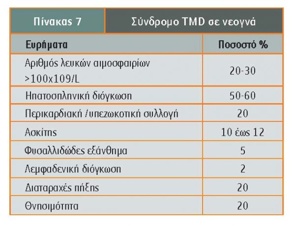- Παροδική μυελοϋπερπλαστική νόσος: Σε ποσοστό 5%-10% των νεογνών με σύνδρομο Down έχει παρατηρηθεί η ονομαζόμενη παροδική μυελοϋπερπλαστική νόσος (transient myeloproliferative disease-TMD), η οποία αρχίζει κατά την ενδομήτριο ζωή και οδηγεί στην παροδική παρουσία βλαστών μεγακαρυοβλαστικής προέλευσης. Σε παιδιά με τρισωμία 21 οι προβαθμίδες της μεγακαρυοκυτταρικής και της ερυθράς σειράς πολλαπλασιάζονται στο εμβρυικό ήπαρ και, μέσω μετάλλαξης του μεταγραφικού αιμοποιητικού παράγοντα GATA1, προκαλείται παθολογική διαφοροποίηση μεγακαρυοκυττάρων και παρουσία βλαστών. Χαρακτηριστική είναι η παρουσία μεγαλύτερου ποσοστού βλαστών στο περιφερικό αίμα σε σχέση με το ποσοστό βλαστών στον μυελό των οστών, παρατήρηση που επιβεβαιώνει την προέλευση των βλαστών από κύτταρα εμβρυϊκής αιμοποίησης όπως το ήπαρ. Στην πλειονότητα των νεογνών η μυελοϋπερπλαστική αυτή κατάσταση υποχωρεί εντός των 3 πρώτων μηνών ζωής, ωστόσο στο 20% περίπου των νεογνών εξελίσσεται σε οξεία μυελογενή λευχαιμία (GATA1 θετική οξεία μεγακαρυοβλαστική λευχαιμία -Μ7) εντός των 4 πρώτων χρόνων της ζωής. Επίσης, 15%-20% των νεογνών με ηπατομεγαλία είναι δυνατόν να εμφανίσουν ηπατική ίνωση (Gamis, Hitzler). Τα κλινικοεργαστηριακά ευρήματα του συνδρόμου της παροδικής μυελοϋπερπλαστικής νόσου των νεογνών με σύνδρομο Down περιγράφονται στον πίνακα 7.