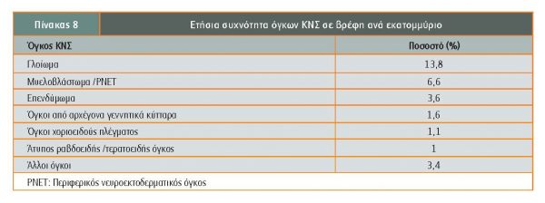 Οι όγκοι ΚΝΣ που διαγιγνώσκονται σε βρέφη, συνιστούν το 10% των όγκων ΚΝΣ που παρατηρούνται στην παιδική ηλικία και σε 50% αφορούν βρέφη <6 μηνών. Σε 65% οι όγκοι έχουν υπερσκηνιδιακή εντόπιση και ο συχνότερος ιστολογικός υπότυπος είναι το γλοίωμα (42,5%). Η χρήση της ακτινοθεραπείας ως θεραπευτικής επιλογής, λόγω της συχνά καταστροφικής συνέπειας στον αναπτυσσόμενο εγκέφαλο του βρέφους, πρέπει να αποφασίζεται με ιδιαίτερη σύνεση. Στον πίνακα 8 αναφέρεται η συχνότητα ανά εκατομμύριο (Bishop, Chedkar).