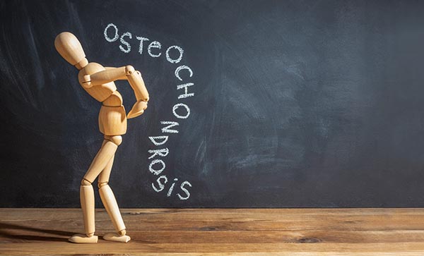 Concept of back pain. A wooden figure depicts a pain in the back. The inscription on a chalkboard osteochondrosis. / iStock