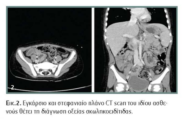 - Υπερηχογράφημα (US), κοιλίας με ευρήματα: διάμετρος αυλού > 6 mm, διάταση, απόφραξη, κοπρόλιθος, ελεύθερο υγρό, μειωμένος περισταλτισμός εντέρου με πάχυνση τοιχώματος.