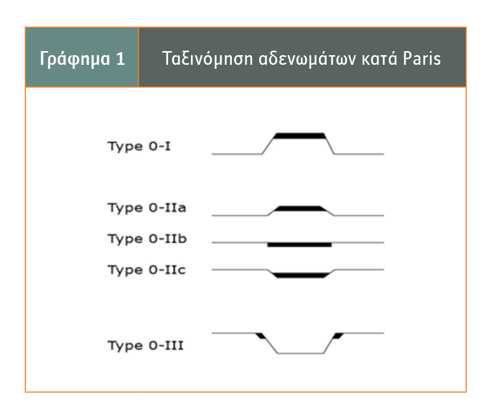 - Τα αδενώματα αποτελούν τη συχνότερη μορφή πολυπόδων. Έχουν κατά καιρούς προταθεί διάφοροι τρόποι ταξινόμησης τους με βάση τα ενδοσκοπικά χαρακτηριστικά τους. Συχνότερα χρησιμοποιούμενη είναι η ταξινόμηση κατά Paris (Εικόνα 1). Ο κυριότερος παράγοντας κινδύνου για την εμφάνισή τους είναι η ηλικία, με την ανεύρεσή τους να κυμαίνεται από 25% στην ηλικία των 20-30 ετών έως 50% στην ηλικία των 70 ετών. Οι άντρες υπερτερούν των γυναικών σε ποσοστά εμφάνισης αδενωμάτων. Συνήθως τα αδενώματα είναι ασυμπτωματικές βλάβες που ανακαλύπτονται τυχαία κατά τη διενέργεια προληπτικής κολονοσκόπησης. Αποτελούν δυνητικά προκαρκινικές βλάβες, αλλά δεν εξελίσσονται όλα σε κακοήθεια. Η διάκριση των ιδιαίτερων χαρακτηριστικών του κάθε αδενώματος και η πρόγνωσή του κατά πόσο ένα συγκεκριμένο αδένωμα μπορεί να εξελιχθεί σε καρκίνο αποτελούν σημαντικό πεδίο της σύγχρονης έρευνας. Ιστολογικά χαρακτηρίζονται ως σωληνώδη, λαχνωτά και σωληνολαχνωτά, με χαμηλόβαθμη ή υψηλόβαθμη δυσπλασία. Συχνότερα είναι τα σωληνώδη που αποτελούν το 70%-80% των αδενωμάτων, με τους δύο άλλους τύπους να ευθύνονται για ισόποσα για το υπόλοιπο 20%-30%. Εξ ορισμού τα αδενώματα έχουν κάποιο βαθμό δυσπλασίας και όσο μεγαλύτερος ο βαθμός της δυσπλασίας, τόσο αυξάνεται ο κίνδυνος εξέλιξης σε κακοήθεια. Η ανίχνευσή τους γίνεται με την ενδοσκόπηση και τη λήψη βιοψιών. Η αντιμετώπιση συνίσταται στην ενδοσκοπική αφαίρεσή τους. Μικρά αδενώματα (<5 mm) μπορούν να αφαιρεθούν με τη λαβίδα βιοψίας. Για μεγαλύτερα αδενώματα συνιστάται η πολυπεκτομή με βρόχο. Σε αυτή ο πολύποδας συλλαμβάνεται με ένα βρόχο, που διέρχεται από το κανάλι του ενδοσκοπίου, και κόβεται είτε ψυχρά είτε με εφαρμογή ρεύματος που παρέχεται από ένα μηχάνημα διαθερμίας. Σε μεγαλύτερους πολύποδες γίνεται προ της εκτομής, υποβλεννογόνια έγχυση φυσιολογικού ορού, ώστε ο πολύποδας να απομακρυνθεί από τα βαθύτερα στρώματα του εντερικού τοιχώματος και να προληφθεί η θερμική βλάβη του εντέρου κατά την εκτομή. Μεγάλοι πολύποδες συχνά δεν είναι δυνατόν να αφαιρεθούν n᾽ block. Σε αυτές τις περιπτώσεις γίνεται τμηματική αφαίρεση του πολύποδα. Ο χρόνος επανελέγχου του ασθενούς μετά από πολυπεκτομή είναι συνάρτηση του τύπου του πολύποδα (αδένωμα – υπερπλαστικός), του αριθμού των πολυπόδων που αφαιρέθηκαν και του ιστολογικού τους τύπου.