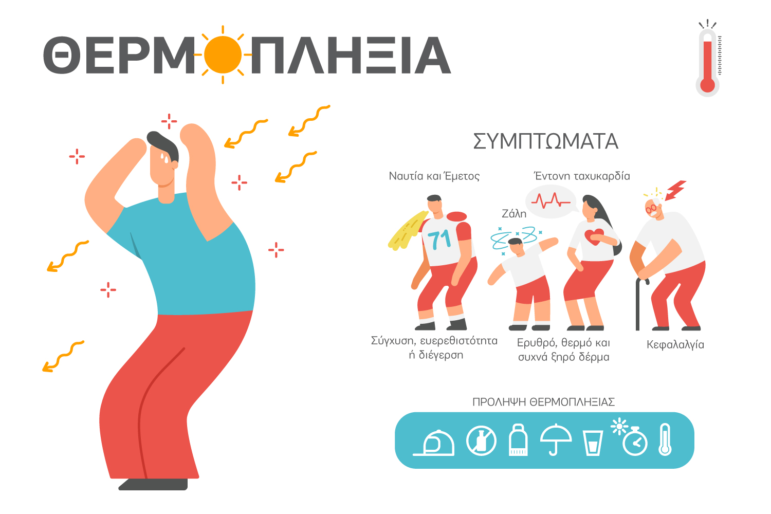 - Παίρνουμε αυξημένα μέτρα προφύλαξης και συμβουλευόμαστε το γιατρό μας εάν πάσχουμε από χρόνια νοσήματα ή λαμβάνουμε φαρμακευτική αγωγή που αυξάνει τον κίνδυνο θερμοπληξίας.