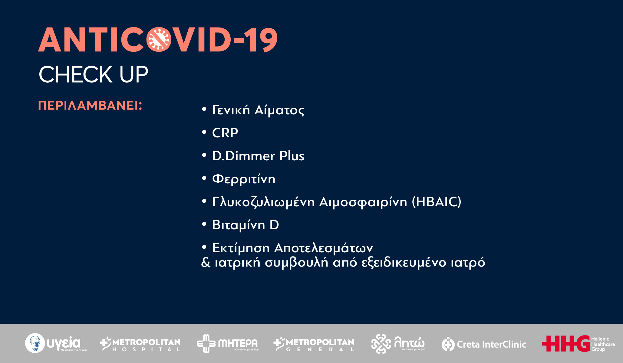 Τo Hellenic Healthcare Group, ο μεγαλύτερος ιδιωτικός όμιλος παροχής υπηρεσιών υγείας στην Ελλάδα, προσφέρει αυτό το check up και στα θεραπευτήρια: Υγεία, Metropolitan Hospital, Μητέρα, Metropolitan General και Creta Interclinic, στη συμβολική τιμή των 40€. Το check up “Score Compass Covid-19” δίνει τη δυνατότητα έγκαιρης εκτίμησης του κινδύνου επιδείνωσης σε ασθενείς, σύμφωνα με τις διεθνείς κατευθυντήριες οδηγίες και περιλαμβάνει τις παρακάτω εξετάσεις: