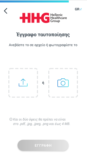 Επιλέγεις το έγγραφο που επιθυμείς (ταυτότητα ή διαβατήριο) και είτε το ανεβάζεις στην εφαρμογή από τα αρχεία του κινητού σου είτε επιλέγεις να το φωτογραφήσεις εκείνη την στιγμή.