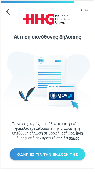 Σε περίπτωση που δεν έχεις την ταυτότητά σου η εφαρμογή my-Ygeia σε συνδέει αυτόματα με την ψηφιακή πύλη gov.gr ώστε να συμπληρώσεις την σχετική Υπεύθυνη Δήλωση, αναγράφοντας όλα τα απαραίτητα προσωπικά σου στοιχεία.